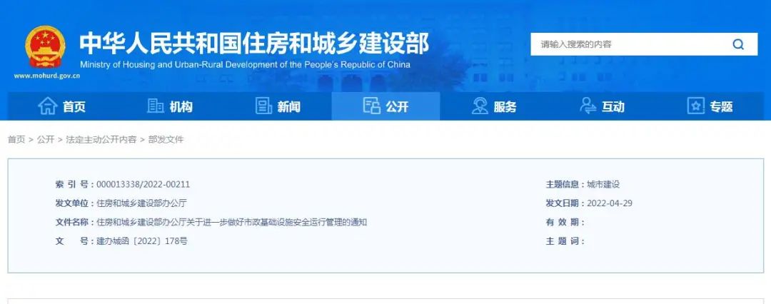 住房和城鄉(xiāng)建設部辦公廳關于進一步做好市政基礎設施安全運行管理的通知建辦城函〔2022〕178號各省、自治區(qū)住房和城鄉(xiāng)建設廳,北京市城市管理委、園林綠化局、水務局,天津市城市管理委、水務局,上海市住房和城鄉(xiāng)建設管委、綠化和市容管理局、水務局,重慶市住房和城鄉(xiāng)建設委、經(jīng)濟和信息化委、城市管理局,海南省水...