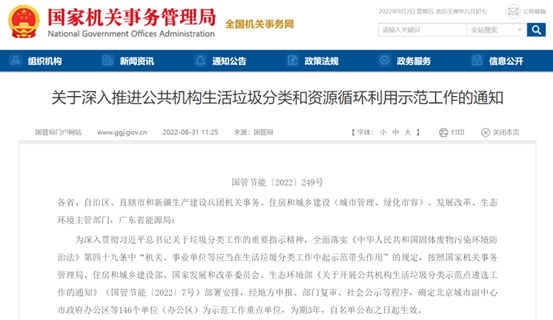 關(guān)于深入推進(jìn)公共機(jī)構(gòu)生活垃圾分類和資源循環(huán)利用示范工作的通知國管節(jié)能〔2022〕249號(hào)各省、自治區(qū)、直轄市和新疆生產(chǎn)建設(shè)兵團(tuán)機(jī)關(guān)事務(wù)、住房和城鄉(xiāng)建設(shè)(城市管理、綠化市容)、發(fā)展改革、生態(tài)環(huán)境主管部門,廣東省能源局:為深入貫徹習(xí)近平總書記關(guān)于垃圾分類工作的重要指示精神,全面落實(shí)《中華人民共和國固體廢...