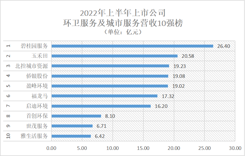 保利物業(yè)、恒大物業(yè)、建業(yè)新生活、金科服務(wù)、粵豐環(huán)保、招商積余、中創(chuàng)環(huán)保、旺能環(huán)境、光大環(huán)境、博世科、城發(fā)環(huán)境等11家上市公司未公布上半年“環(huán)衛(wèi)服務(wù)”或“城市服務(wù)”營收數(shù)據(jù)。其中,碧桂園服務(wù)、玉禾田、北控城市資源、僑銀股份、盈峰環(huán)境、福龍馬、啟迪環(huán)境、首創(chuàng)環(huán)保、世茂服務(wù)、雅生活服務(wù)等10家上市公司進(jìn)入...