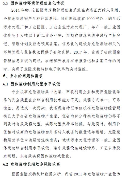 固體廢物污染防治是環(huán)境保護(hù)工作的重要組成部分,尤其是危險(xiǎn)廢物(含醫(yī)療廢物),因其含有有毒有害成分,若利用和處置不當(dāng),將對(duì)水體、大氣和土壤造成嚴(yán)重污染,甚至威脅人民群眾身心健康。妥善利用、處置固體廢物是防范環(huán)境風(fēng)險(xiǎn)的重要措施之一,是整體改善水、大氣和土壤環(huán)境質(zhì)量的重要保障?!笆濉逼陂g,按照《危險(xiǎn)廢物“十二五”污染防治規(guī)劃》要求,查清了全省固體廢物的現(xiàn)狀,對(duì)全省危險(xiǎn)廢物產(chǎn)生單位實(shí)施分級(jí)、標(biāo)準(zhǔn)化管理,危險(xiǎn)廢物規(guī)范化管理和經(jīng)營(yíng)水平不斷提高。