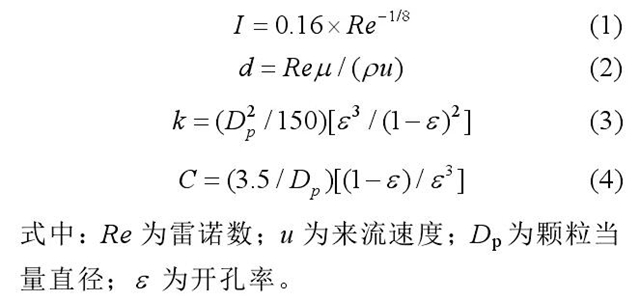 采用分區(qū)劃分網(wǎng)格的方法,對(duì)電袋復(fù)合除塵器的不同區(qū)域進(jìn)行前處理。劃分出了4種不同網(wǎng)格數(shù)量,經(jīng)過(guò)計(jì)算得出1100萬(wàn)網(wǎng)格與實(shí)際出口壓力值做比較接近,出口負(fù)壓為2850Pa,湍流強(qiáng)度I和水力直徑d分別見(jiàn)公式(1)和公式(2)。各壁面均設(shè)為無(wú)滑移壁面,空氣密度ρ為1.225kg/m3,黏度μ為2.425x10-5kg/m3;濾料的厚度△m=2mm,滲透率k見(jiàn)公式(3),內(nèi)部阻力系數(shù)C'見(jiàn)公式(4)。