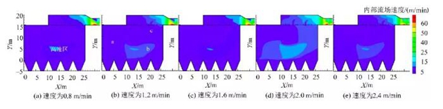 圖2(c)是速度為1.6m/min的云圖,在此工況下,濾袋下部空間的“高速區(qū)”呈帶狀斜向上延伸至濾袋區(qū)后墻出口。在此區(qū)域內(nèi),氣流速度大,氣流量大,本工況,濾袋底部空間最大氣流速度為15m/min,濾袋區(qū)的最大氣流速度在后墻中部濾袋處,為10.3m/min,最小氣流速度在濾袋區(qū)的前端下部,為0.4m/s。速度差值進(jìn)一步增大。