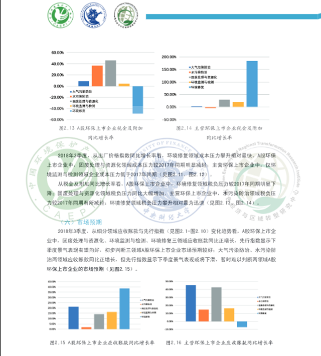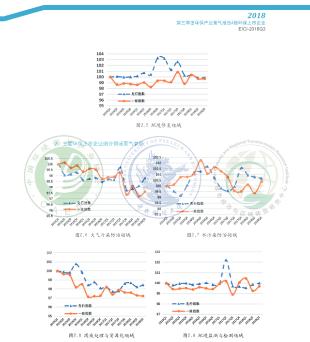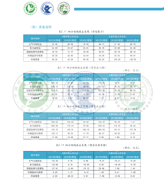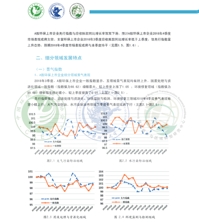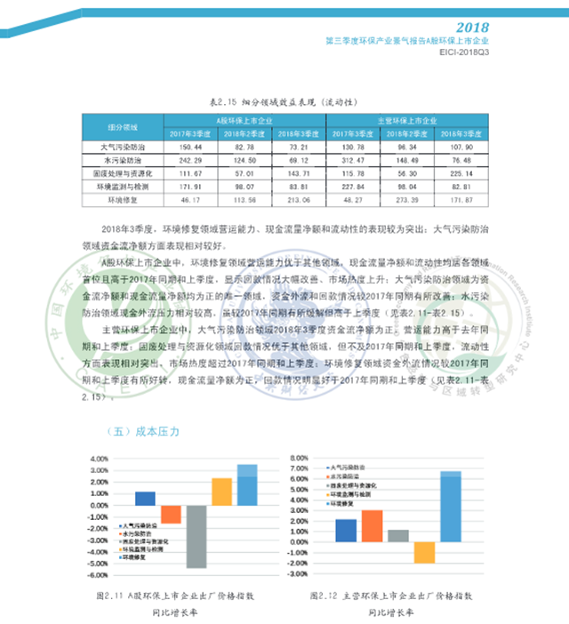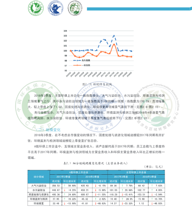 從細(xì)分領(lǐng)域看,A股環(huán)保上市企業(yè)2018年3季度各領(lǐng)域景氣表現(xiàn)呈現(xiàn)不同程度的回暖,主營環(huán)保上市企業(yè)在大氣污染防治、水污染防治、環(huán)境監(jiān)測和檢測三領(lǐng)域景氣表現(xiàn)回升。固廢處理與資源化領(lǐng)域規(guī)模較2017年同期有所擴(kuò)大, A股環(huán)保上市企業(yè)稅負(fù)壓力同比大幅增加,成本壓力較去年同期明顯減輕,預(yù)計(jì)該領(lǐng)域下季度景氣有望上行:大氣污染防治領(lǐng)域資金外流和國款情況較2017年同期有所改善,預(yù)計(jì)該領(lǐng)域A股環(huán)保上市企業(yè)下季度景氣表現(xiàn)下滑,主營環(huán)保上市企業(yè)下季度景氣有望上行:環(huán)境監(jiān)測與檢測領(lǐng)域規(guī)模較上季度呈擴(kuò)張態(tài)勢, 效益表現(xiàn)總體優(yōu)于上季度,下季度該領(lǐng)域景氣表現(xiàn)有望上行:環(huán)境修復(fù)領(lǐng)域營運(yùn)能力、現(xiàn)金流量凈額和流動(dòng)性表現(xiàn)相對(duì)較好,A股環(huán)保上市企業(yè)稅負(fù)壓力較去年同期大幅下降,主營環(huán)保上市企業(yè)稅負(fù)壓力快速攀升,預(yù)計(jì)下季度A股環(huán)保上市企業(yè)景氣表現(xiàn)小幅上行,主營環(huán)保上市企業(yè)景氣或?qū)⑾禄核廴痉乐晤I(lǐng)域利潤總額、流動(dòng)性不及去年同期和上季度,A股環(huán)保上市企業(yè)成本壓力較去年同期有所減輕,主營環(huán)保上市企業(yè)稅負(fù)壓力同比小幅減輕,預(yù)計(jì)該領(lǐng)域下季度景氣表現(xiàn)下行。