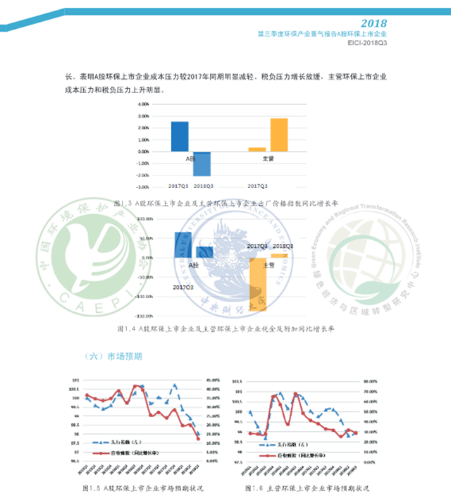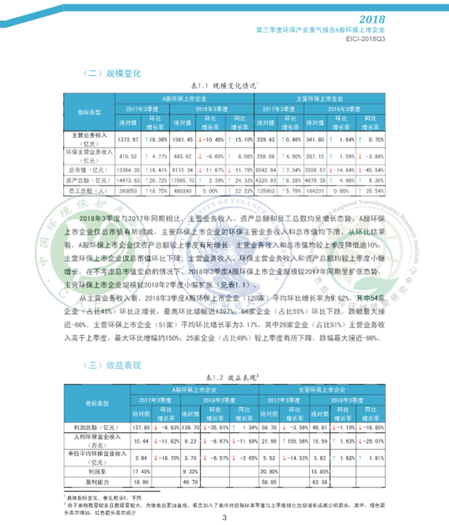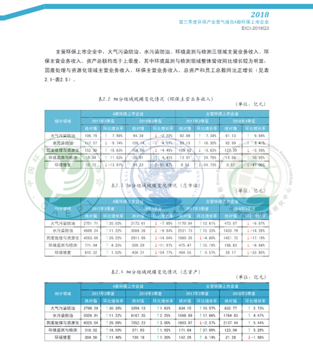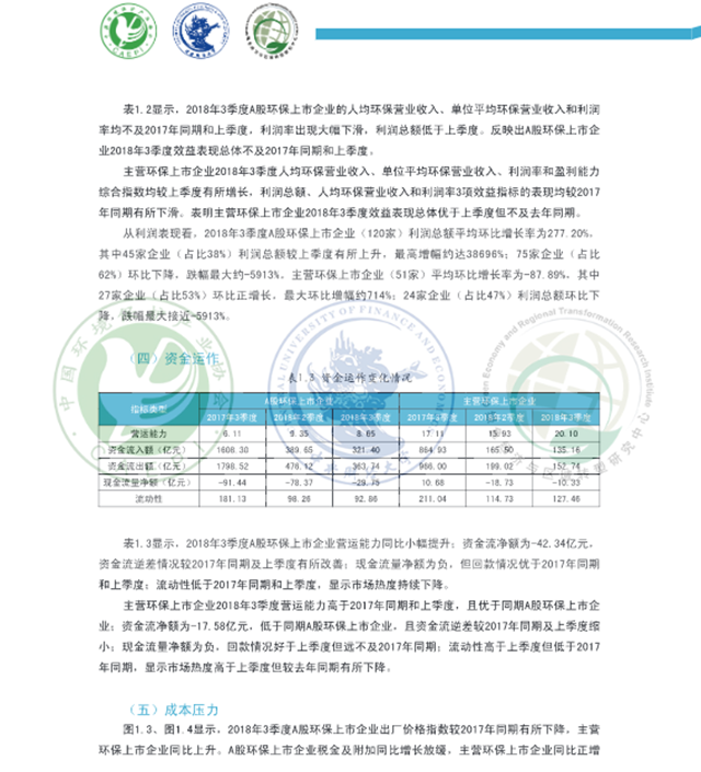 2018年3季度,從主營業(yè)務(wù)收入、環(huán)保主營業(yè)務(wù)收入、資產(chǎn)總額和員工總數(shù)看,A股環(huán)保上市企業(yè)規(guī)模較2017年同期呈現(xiàn)擴(kuò)張態(tài)勢,主營環(huán)保上市企業(yè)規(guī)模較上季度小幅擴(kuò)張:效益表現(xiàn)總體不及去年同期:資金流逆差情況較2017年同期和上季度有所改善, 回款情況好于上季度:A股環(huán)保上市企業(yè)成本壓力較2017年同期明顯減輕、稅負(fù)壓力增長放緩,主營環(huán)保上市企業(yè)成本壓力和稅負(fù)壓力上升較為明顯:預(yù)期A股環(huán)保上市企業(yè)2018年4季度市場表現(xiàn)可能欠佳,主營環(huán)保上市企業(yè)下季度市場表現(xiàn)或?qū)⑴c本季度持平。