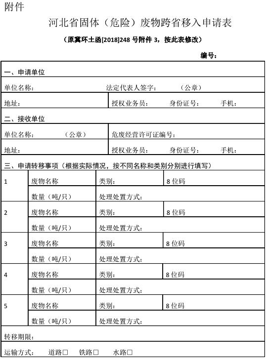 二、從嚴把控危險廢物跨省轉入。各級生態(tài)環(huán)境部門要認真貫徹《河北省固體廢物污染環(huán)境防治條例》,嚴格控制省外的危險廢物轉移至我省行政區(qū)域內貯存或者處置。要對照“河北省固體(危險)廢物跨省移入申請表”(附件),從嚴核查跨省轉入申請。