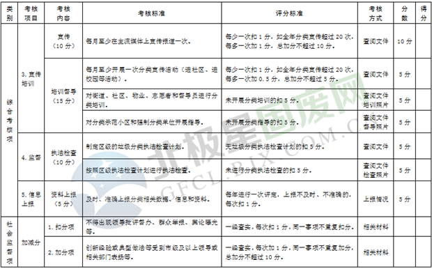 綜合考核:主要是考核各區(qū)市縣制度建設(shè)、運(yùn)行管理、宣傳培訓(xùn)、信息報(bào)送和日常檢查執(zhí)法等情況,由市垃圾分類工作領(lǐng)導(dǎo)小組人員采取現(xiàn)場(chǎng)檢查和資料查閱等方式進(jìn)行。
