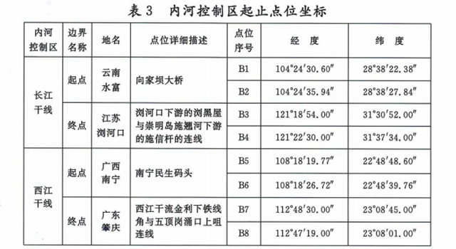 內(nèi)河控制區(qū)范圍為長(zhǎng)江干線(云南水富至江蘇瀏河口)、西江干線(廣西南寧至廣東肇慶段)的通航水域,起止點(diǎn)位坐標(biāo)見(jiàn)表3。