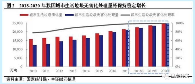 《“十三五”全國(guó)城鎮(zhèn)生活垃圾無(wú)害化處理設(shè)施建設(shè)規(guī)劃》(以下簡(jiǎn)稱“垃圾處理十三五規(guī)劃”)指出,“十三五”期間全國(guó)規(guī)劃新增生活垃圾無(wú)害化處理能力50.97萬(wàn)噸/日(包含“十二五”續(xù)建12.9萬(wàn)噸/日),全國(guó)城鎮(zhèn)生活垃圾無(wú)害化處理設(shè)施建設(shè)總投資約2,518.4 億元。到2020年底,直轄市、計(jì)劃單列市和省會(huì)城市(建成區(qū))生活垃圾無(wú)害化處理率達(dá)到100%,其他設(shè)市城市、縣城(建成區(qū))、建制鎮(zhèn)生活垃圾無(wú)害化處理率分別達(dá)到95%、80%、70%以上。以2017年城市生活垃圾無(wú)害化處理率97.74%和城市生活垃圾清運(yùn)量增速5.69%為基準(zhǔn),假定無(wú)害化處理率每年上升0.06個(gè)百分點(diǎn),未來(lái)每年城市生活垃圾清運(yùn)量增速為5%(考慮經(jīng)濟(jì)下行壓力,保守估計(jì)),測(cè)算2018-2020年我國(guó)城市生活垃圾無(wú)害化處理量分別為2.22億噸、2.35億噸和2.48億噸。根據(jù)2018年9月中共中央、國(guó)務(wù)院印發(fā)的《鄉(xiāng)村振興戰(zhàn)略規(guī)劃(2018-2022年)》要求,推進(jìn)農(nóng)村生活垃圾治理、農(nóng)村污水處理、實(shí)施廁所革命、消除農(nóng)村黑臭水體、提升村容村貌是補(bǔ)齊突出短板的重要內(nèi)容。鄉(xiāng)村振興戰(zhàn)略作為2017年及2018年中央經(jīng)濟(jì)工作會(huì)議部署的重點(diǎn)工作,正逐步得到實(shí)施。隨著農(nóng)村未處理垃圾存量的消化和處理范圍擴(kuò)大,未來(lái)農(nóng)村垃圾處理規(guī)模有較大增長(zhǎng)空間。