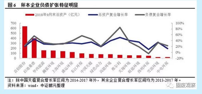 樣本企業(yè)總資產(chǎn)規(guī)模差異較大,負(fù)債帶動(dòng)資產(chǎn)擴(kuò)張?zhí)卣髅黠@。從2018年9月末資產(chǎn)規(guī)模來(lái)看,首創(chuàng)股份居首,啟迪桑德位于第二,均超過(guò)350億元,100-200億元的企業(yè)有4家,100億元以下企業(yè)10家。生活垃圾焚燒發(fā)電領(lǐng)域市場(chǎng)空間大,國(guó)家支持力度強(qiáng),項(xiàng)目運(yùn)營(yíng)期經(jīng)濟(jì)效益穩(wěn)定,在PPP政策的推動(dòng)下,業(yè)內(nèi)企業(yè)積極通過(guò)投資、并購(gòu)占領(lǐng)市場(chǎng),2013-2017年樣本企業(yè)總資產(chǎn)復(fù)合增速29.83%,16家樣本企業(yè)中有11家負(fù)債年復(fù)合增速超過(guò)總資產(chǎn)復(fù)合增速。