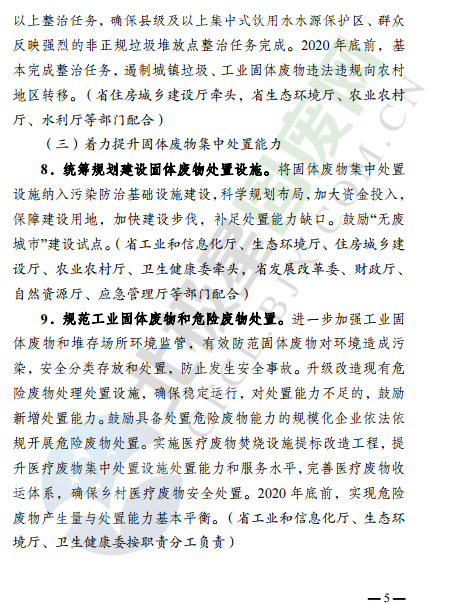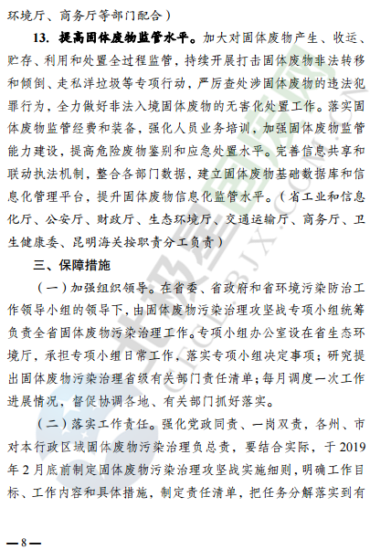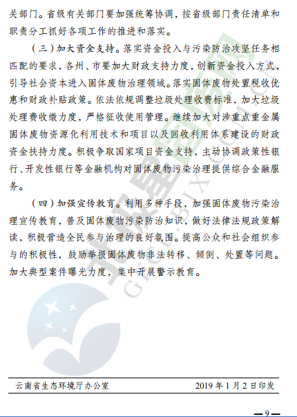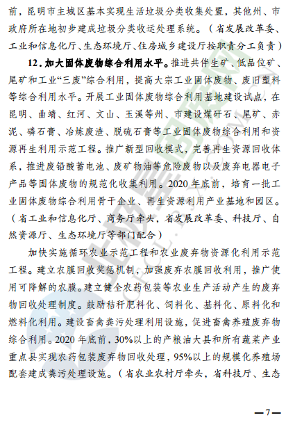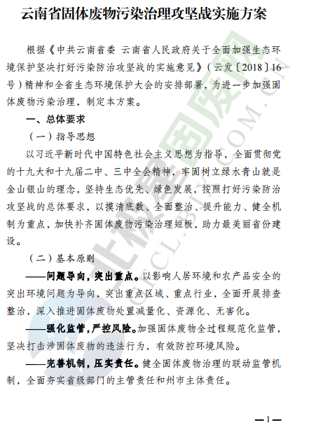 近日,云南省環(huán)境保護(hù)廳發(fā)布了云南省固體廢物污染治理攻堅戰(zhàn)實施方案,針對固廢處理監(jiān)管、治理重點方向和行業(yè)等提出了明確要求,詳情如下: