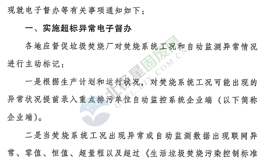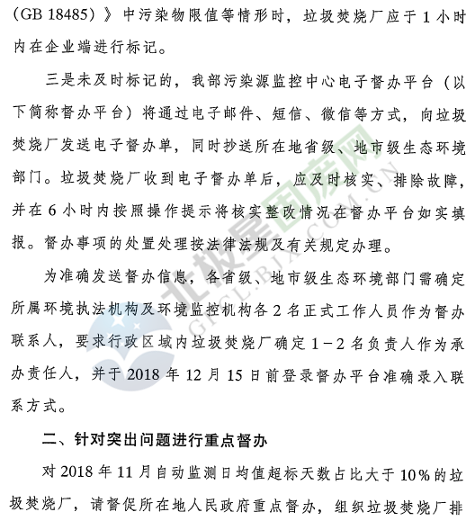 日前生態(tài)環(huán)境部辦公廳下發(fā)了加急通知:《關(guān)于實(shí)施生活垃圾焚燒發(fā)電廠煙氣排放自動(dòng)監(jiān)控電子督辦等有關(guān)事項(xiàng)的通知》,通知提到,即日起(發(fā)文之日起)生態(tài)環(huán)境部將對(duì)生活垃圾焚燒發(fā)電廠實(shí)施超標(biāo)異常電子督辦。各地應(yīng)督促垃圾焚燒廠對(duì)焚燒系統(tǒng)公開(kāi)和自動(dòng)監(jiān)測(cè)異常情況進(jìn)行主動(dòng)標(biāo)記。針對(duì)突出問(wèn)題進(jìn)行重點(diǎn)督辦,對(duì)2018年11月自動(dòng)監(jiān)測(cè)日均值超標(biāo)天數(shù)占比大于10%的垃圾焚燒發(fā)電廠,請(qǐng)督促所在地人民政府重點(diǎn)督辦,組織垃圾焚燒廠排查超標(biāo)原因、制定并落實(shí)整改措施。
