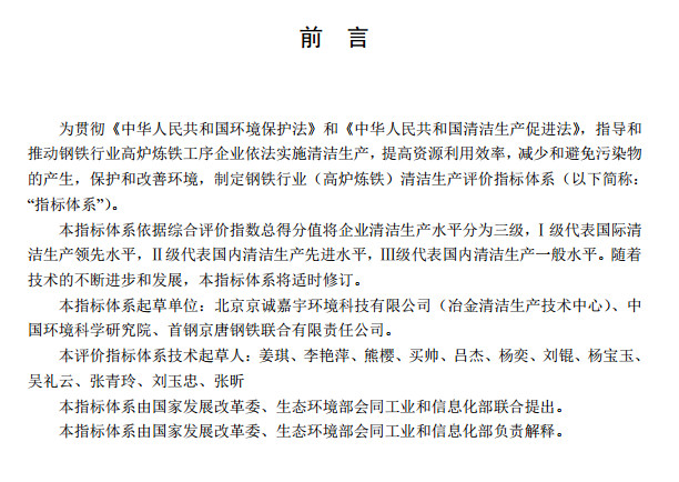 日前,國家發(fā)改委、生態(tài)環(huán)境部、工信部聯(lián)合印發(fā)了鋼鐵行業(yè)(高爐煉鐵)清潔生產評價指標體系,規(guī)定了在高爐煉鐵工藝中有關大氣污染物的排放指標,包括顆粒物、二氧化硫、氮氧化物,其中高爐環(huán)境除塵及礦槽除塵配備有齊全的除塵裝置,確保無可見煙粉塵外逸。全文如下: