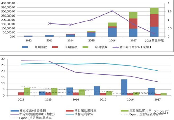 截至2018年第三季度,公司在建工程賬面余額約406,115萬元,是同期固定資產(chǎn)賬面價值的53倍,主要通過PPP業(yè)務模式開展。隨著業(yè)務擴張,近幾年公司的資本支出水平明顯, 2016年的資本支出/折舊攤銷高達13,同期的負債水平也明顯上升。2017年公司加大長期借款額度,長期負債占比上升至32,同比增加約50%。但企業(yè)的營運資金效率水平欠缺,自2016年,長期債務/營運資金比例明顯增加,2017年比值接近202,償債壓力顯現(xiàn)。而2015-2017年企業(yè)的經(jīng)營現(xiàn)金流凈額呈現(xiàn)負值,盈利空間下滑,而2016、2017的應收賬款占比在50%以上,且回款率有所降低,壞賬風險增加。基于此,公司未來的產(chǎn)能釋放和成本控制將對公司可持續(xù)經(jīng)營起到關鍵作用。2017年年報顯示公司的多個項目已經(jīng)完工轉(zhuǎn)入固定資產(chǎn),2018-2019年將開始投產(chǎn)。某種程度上和公司的組織調(diào)整相呼應。