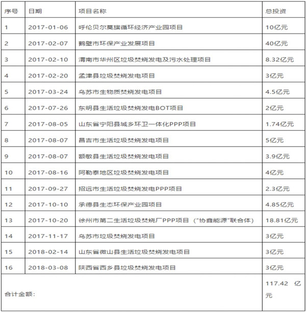 據(jù)統(tǒng)計,2017年至今,盛運環(huán)?;蛑袠嘶蚝炇鹆硕噙_18個項目,其中多數(shù)為垃圾焚燒項目,少數(shù)為污水處理、環(huán)衛(wèi)服務項目,總投資達117.42億元人民幣。