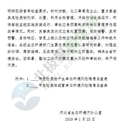 近日,河北省生態(tài)環(huán)境廳發(fā)布了關(guān)于春節(jié)期間加強(qiáng)危險廢物領(lǐng)域環(huán)境風(fēng)險防控工作的緊急通知,要求加大涉危險廢物領(lǐng)域重點(diǎn)行業(yè)企業(yè)的環(huán)境監(jiān)管力度,2月份,全省暫停實(shí)施跨界危險廢物轉(zhuǎn)運(yùn),特殊情況必須轉(zhuǎn)移的,一事一報(bào)。詳情如下: