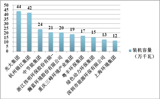當(dāng)前我國垃圾焚燒發(fā)電行業(yè)市場競爭主體主要為大型國資背景企業(yè)和優(yōu)秀民營企業(yè)。2016年裝機(jī)容量排名前10名的垃圾焚燒發(fā)電投資企業(yè)依次為中國光大國際有限公司(43.53萬千瓦)、杭州錦江集團(tuán)(41.9萬千瓦)、中國節(jié)能集團(tuán)(24.1萬千瓦)、浙江偉明環(huán)保股份有限公司(20.55萬千瓦)、瀚藍(lán)環(huán)境股份有限公司(20萬千瓦)、重慶三峰環(huán)境產(chǎn)業(yè)集團(tuán)有限公司(18.6萬千瓦)、粵豐環(huán)保集團(tuán)(16.8萬千瓦)、綠色動(dòng)力環(huán)保集團(tuán)股份有限公司(15.45萬千瓦)、深圳市能源環(huán)保有限公司(12.85千瓦)、上海環(huán)境集團(tuán)(11.7萬千瓦)和北京控股有限公司(11.55萬千瓦),具體詳見圖6。