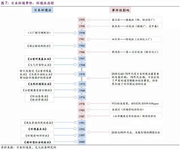 20世紀(jì)50-70年代,日本快速實(shí)現(xiàn)工業(yè)化,經(jīng)濟(jì)成就舉世矚目,但期間各類公害事件頻發(fā),成為了尖銳的社會(huì)和政治問題。在此背景下,以1967年《公害對策基本法》為核心的環(huán)保法律體系應(yīng)運(yùn)而生,日本環(huán)保產(chǎn)業(yè)開始了上升周期。雖然環(huán)保政策在80年代初經(jīng)濟(jì)下行時(shí)稍有反復(fù),但也僅是過程中的擾動(dòng)。隨著工業(yè)化及城鎮(zhèn)化達(dá)到一定階段,日本末端治污需求逐漸減弱,2000年以《循環(huán)型社會(huì)促進(jìn)法》為核心的法律體系應(yīng)運(yùn)而生,日本大力推進(jìn)循環(huán)經(jīng)濟(jì)的國策,以減輕自身由于資源匱乏的限制,實(shí)現(xiàn)了法律體系由“被動(dòng)”到“主動(dòng)”的過程。
