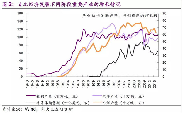 20世紀(jì)70年代起,尼克松沖擊、兩次石油危機(jī)以及廣場協(xié)議,致日本經(jīng)濟(jì)面臨較大的考驗(yàn)。1974年是日本經(jīng)濟(jì)第一個(gè)重要的分界點(diǎn),對于資源貧乏和市場狹窄的日本來說,期初人口及原材料廉價(jià)的優(yōu)勢已經(jīng)消失,只有通過產(chǎn)業(yè)結(jié)構(gòu)的升級,發(fā)展節(jié)能和精細(xì)化高附加值的產(chǎn)品,才能實(shí)現(xiàn)日本企業(yè)競爭力進(jìn)一步提升。在此期間,日本汽車、半導(dǎo)體產(chǎn)業(yè)的騰飛便是一個(gè)很好的例子,新的增長極的出現(xiàn),也將石油危機(jī)、資源約束的影響降到較低的水平。