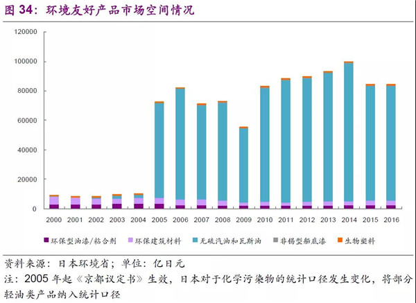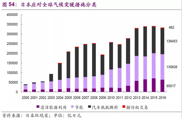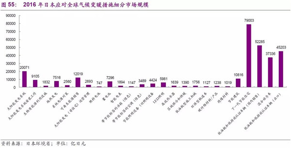 在日本應(yīng)對全球氣候變暖措施分類上,主要有清潔能源利用、節(jié)能、汽車低耗燃料等具體措施,2016年整體的市場空間可以達(dá)33萬億日元(日本環(huán)境省數(shù)據(jù))。具體細(xì)分來看,以2016年為例,節(jié)能建筑、低油耗低排放及混合動(dòng)力車輛、太陽能產(chǎn)業(yè)、蓄電池、節(jié)能照明設(shè)施等是未來重要的發(fā)展方向。