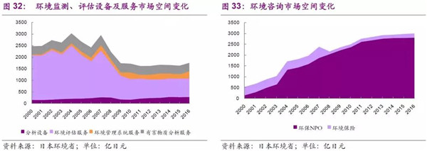 在環(huán)境支持管理科目分為很多細(xì)項(xiàng),如環(huán)境監(jiān)測、評估設(shè)備及服務(wù)和環(huán)境咨詢市場。日本基本已經(jīng)建成較為全面的環(huán)境監(jiān)測體系,因此近些年來設(shè)備需求相對穩(wěn)定,2016年為291億日元;更多的市場需求以服務(wù)為主,其中2016年,環(huán)境評估為792億日元市場空間,環(huán)境管理系統(tǒng)服務(wù)為313億日元市場空間,有害物質(zhì)分析服務(wù)為353億日元市場空間。