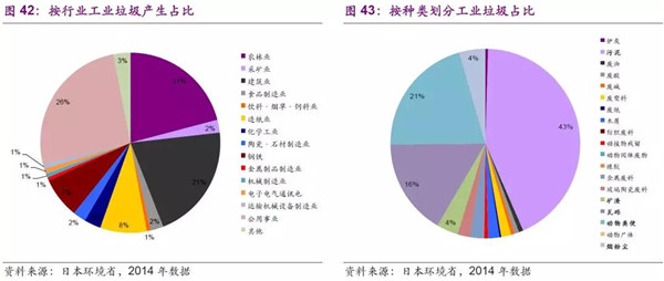 按行業(yè)劃分分析工業(yè)垃圾產(chǎn)量:公用事業(yè)行業(yè)產(chǎn)生垃圾最多,占比最高26%,其次為農(nóng)林業(yè)和建筑業(yè)均為21%;按種類劃分污泥占比最高,達(dá)到43%,其次為動(dòng)物糞便為21%,再次是瓦礫占比為16%。從分類來看,產(chǎn)生行業(yè)和垃圾種類能夠較好的對應(yīng)上。