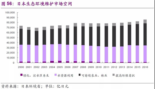 日本的生態(tài)維護(hù)市場主要是面向自然資源的維護(hù),主要體現(xiàn)在水資源利用和可持續(xù)發(fā)展農(nóng)業(yè)和林業(yè)。市場空間方面,2016年綠化、濱水區(qū)再生為1781億日元、水資源利用3.3萬億日元、可持續(xù)農(nóng)業(yè)及林業(yè)為4.4萬億日元、提高環(huán)保意識措施為6793億日元。