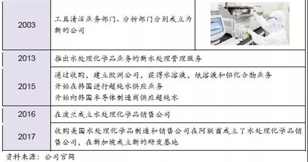 公司起步于鍋爐清洗化學(xué)品銷售,在成立早期雖經(jīng)歷一定坎坷,但最終公司的技術(shù)和產(chǎn)品逐漸被市場認(rèn)可,成為市場的主導(dǎo)產(chǎn)品。伴隨日本工業(yè)化進(jìn)程發(fā)展,1953年后公司的業(yè)務(wù)范圍不僅局限于化學(xué)品產(chǎn)品,也開始進(jìn)入設(shè)備領(lǐng)域,尤其是在水處理設(shè)備市場,如:離子交換樹脂、水軟化及純水設(shè)備是公司具有核心競爭力的產(chǎn)品。公司通過不斷學(xué)習(xí)并獲取過濾設(shè)備、流量控制等多項(xiàng)技術(shù),逐步確立了鍋爐水供應(yīng)的市場地位。