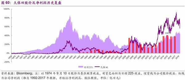 我們對公司1974-2018年的股價(jià)及凈利潤進(jìn)行了復(fù)盤。公司作為的全球農(nóng)業(yè)機(jī)械和環(huán)境領(lǐng)域設(shè)備制造商,受經(jīng)濟(jì)周期性影響較為顯著,具有典型的周期股屬性。公司上市后的早期階段持續(xù)跑輸大盤,在20世紀(jì)80年代末資產(chǎn)泡沫階段,表現(xiàn)也較為低迷;2003-2007年全球經(jīng)濟(jì)繁榮,尤其是中國和北美的業(yè)務(wù)帶動(dòng)公司業(yè)務(wù)進(jìn)一步發(fā)展,公司業(yè)績穩(wěn)步提升(2005年的業(yè)績提升主要系收到了586億日元養(yǎng)老金替代計(jì)劃的政府補(bǔ)助),股票開始獲得超額收益;隨后受次貸危機(jī)影響,公司股價(jià)隨業(yè)績同步走低,直到2012年后日元貶值至出口轉(zhuǎn)好,疊加全球經(jīng)濟(jì)回暖北美和東南亞銷售回暖,公司在2013-2014年的業(yè)績才顯著轉(zhuǎn)好;此后公司股價(jià)隨日本股市整體上漲,表現(xiàn)優(yōu)異至今。