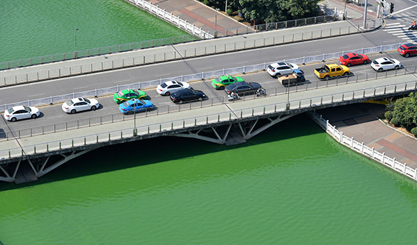 2018年9月5日,南昌市撫河故道水體發(fā)生大面積的藍藻爆發(fā),從高樓上俯瞰,整個水體墨綠一片,如同綠色油漆一般。 東方IC 資料圖