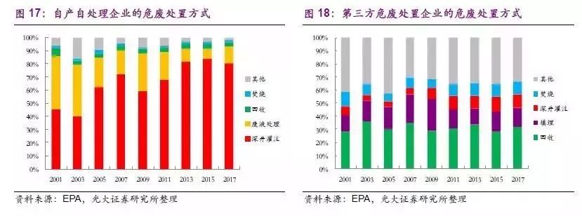 (3)危廢處置方式求同存異。整體來看,美國危廢處置方式的選擇已基本統(tǒng)一,深井灌注已成為美國危廢處置的主流方式,自2013年深井灌注處置危廢量的占比穩(wěn)定在70%左右,廢液處理(僅適用于液費)、能量回收、焚燒、填埋位列2-5 位。但是另一方面,第三方處置和自產(chǎn)自處理的危廢處置方式有著較大的不同。石油、化工等大型企業(yè)多使用深井灌注處理自己產(chǎn)出的危廢(占比達80%以上),因其處置手段安全且成本相對較低;而第三方處置企業(yè)的主流處置方式則是回收利用(包括能量、金屬、溶劑等,占比近30%),填埋、焚燒、深井灌注等處置方式的占比均在10%左右。處置方式差異化的主要原因是自產(chǎn)自處理企業(yè)多為石油和化工企業(yè),危廢種類多為液費,深井灌注具有顯著的成本優(yōu)勢;而第三方處置企業(yè)接收的危廢種類更加多樣化,液費占比也相對較低(30%左右),回收、焚燒、填埋等處置方式更符合其成本控制和利益獲取的要求,所以上述處置方式的占比更多。