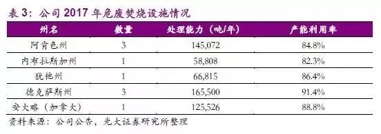 危廢焚燒方面,公司擁有北美共13個商業(yè)危險廢物焚化爐中的9個,是北美這類設施的最大運營商。公司垃圾焚燒實際處理能力為561,721噸,2017年的平均使用率為87.6%。