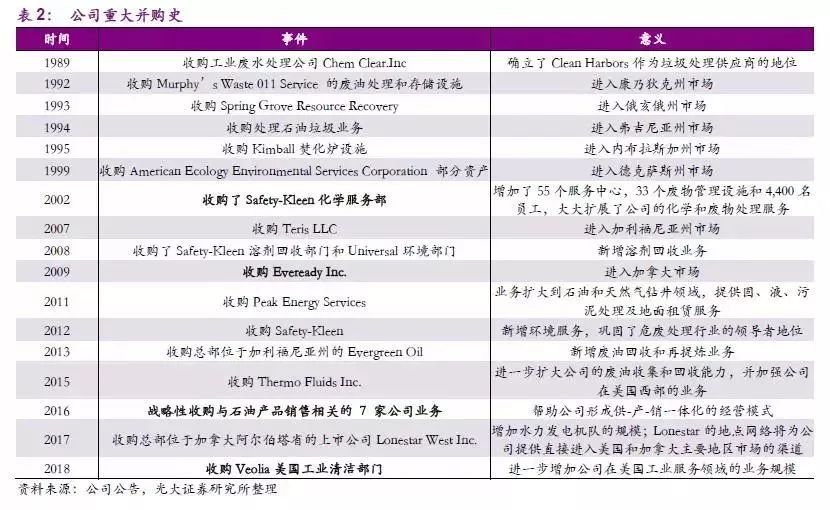 公司上在原有危廢處理技術(shù)的基礎上,通過兼并收購增添一系列新的服務領域。2008年,公司通過收購Safety-Kleen 溶劑回收部門和Universal 環(huán)境部門,開始涉足溶劑回收市場,新增大量業(yè)務。2009年,公司收購Eveready,在進軍加拿大市場的同時,擴大了公司能源和工業(yè)服務范圍。能源和工業(yè)部門為石油和天然氣勘探和生產(chǎn),煉油,石化,紙漿和造紙以及電力公用事業(yè)終端市場等提供一系列服務。此前,Clean Harbors 在這一領域的傳統(tǒng)業(yè)務相對較小,收購Eveready 將公司的能源和工業(yè)服務收入從3千萬增加到5.5~6億,使其從一個小眾玩家成長為了市場上該項業(yè)務強有力的競爭對手。2011年,公司收購 Peak Energy Services,提供固、液、污泥處理及地面租賃服務,將業(yè)務擴大到石油和天然氣鉆井領域。2012年,公司收購北美領先的廢油回收和再精煉、零件清潔及環(huán)境解決方案公司Safety-Kleen,是公司歷史上最大規(guī)模收購。對Safety-Kleen的并購使得公司成為北美最大的二手油重磨機和回收商。此次收購新增了環(huán)境服務業(yè)務,進一步鞏固了公司危廢處理行業(yè)的領導者地位。公司在2013年和2015年相繼收購了總部位于加利福尼亞州的Evergreen Oil 及 Thermo Fluids Inc.,提升公司廢油回收和再精煉能力,進一步增強業(yè)務能力。