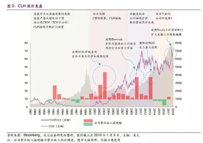 公司在成立后的近40年里,通過大大小小近40余次外延并購,在增加危險廢物處理設施的數(shù)量和覆蓋區(qū)域、擴大業(yè)務服務范圍的同時,也致力于增添新的涵蓋多個行業(yè)和業(yè)務類型的服務領域、擴大服務種類,最終從一家小型油罐清潔公司成長為北美領先的環(huán)境和工業(yè)服務提供商和最大的危險廢物處理公司。尤其是在美國危廢行業(yè)十年調(diào)整蕭條期的時候,通過一次次并購,公司不僅生存了下來,還改變了市場格局,逐漸成為行業(yè)龍頭??v觀公司整個并購過程,可以大致分為三個階段。