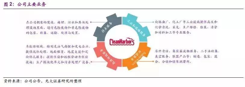 CleanHarbors總部設在馬薩諸塞州的諾韋爾,最初成立時只有一輛卡車和四名員工為當?shù)仄髽I(yè)運輸和處置危險廢物。三十年來,公司通過不斷的并購,“橫向”上增加危險廢物處理設施的數(shù)量和覆蓋區(qū)域,擴大業(yè)務服務范圍,從馬薩諸塞州走向全美,再走向加拿大等其他北美國家;“縱向”上在原有危廢處理技術(shù)的基礎上,增添一系列新的服務領域,涵蓋多個行業(yè)和業(yè)務類型,如溶劑回收、石油和天然氣鉆井領域服務、環(huán)境服務等。目前公司下設技術(shù)服務(Technical Services)、工業(yè)和現(xiàn)場服務(Industrial and Field Services)、能源領域服務(Oil, Gas and loading Services)、Safety-Kleen環(huán)境服務四大部門。