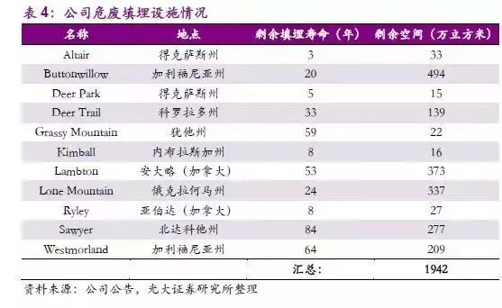 危廢填埋方面,公司在美國和加拿大共擁有11個活躍的垃圾填埋場,其中兩個是非商業(yè)垃圾填埋場,他們只接受來自公司焚化爐的垃圾。其余9個均為商業(yè)用垃圾填埋場,7個允許用于處置危險廢物,另2個用于非處置危險工業(yè)垃圾處理和城市固體垃圾處理。目前,這些商用垃圾填埋場的仍有約1942萬立方米的剩余容量。
