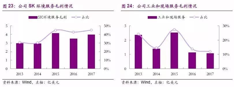 除傳統(tǒng)的技術(shù)服務之外,公司還提供SK環(huán)境及性能產(chǎn)品服務、工業(yè)和現(xiàn)場服務、以及能源領域(石油天然氣和住宿)服務三大業(yè)務,努力向“一站式服務”的服務提供商靠攏。其中,前兩種業(yè)務和傳統(tǒng)的技術(shù)服務共同構(gòu)成了公司的核心增長動力,三者營業(yè)收入占比高達96%;而能源領域服務在未來有望隨著美國頁巖氣革命的發(fā)展給公司帶來新的增量。