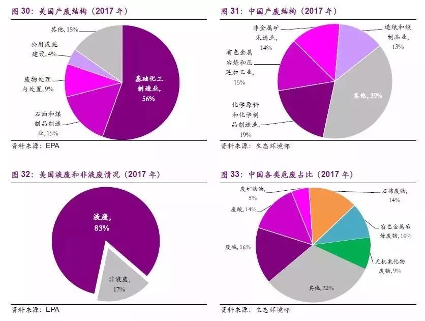 從產(chǎn)廢結(jié)構(gòu)上來看,美國是石油化工生產(chǎn)大國,其產(chǎn)廢結(jié)構(gòu)中基礎化工以及石油/煤制品制造業(yè)的產(chǎn)廢占比合計高達71%(2017年);由于石化企業(yè)多產(chǎn)生液態(tài)危廢,因而美國的危廢產(chǎn)量中83%為液態(tài)危廢。而我國的化工行業(yè)產(chǎn)廢僅占總量的19%,且產(chǎn)廢行業(yè)較為分散,有色金屬冶煉、非金屬礦采選、造紙等行業(yè)的產(chǎn)廢占比均超過10%。另一方面,液態(tài)危廢在國內(nèi)危廢總體結(jié)構(gòu)中占比較小,以目前的廢物結(jié)構(gòu)看,將廢堿(15.67%)、廢酸(14.37%)、廢油(5.36%)全看作液態(tài)危廢,合計占比僅為35%。