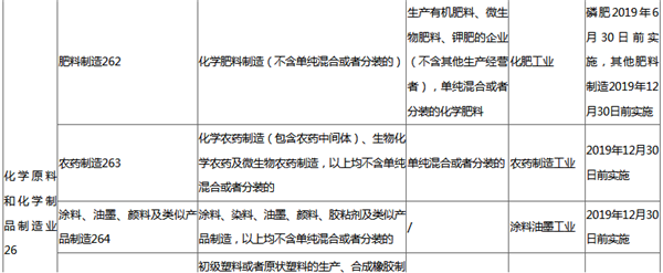 2019年6月30日前納入排污許可管理的細(xì)分行業(yè)有:牲畜飼養(yǎng)031,家禽飼養(yǎng)032、乳制品制造144、調(diào)味品和發(fā)酵制品制造146、方便食品制造143,其他食品制造149、酒的制造151、制鞋業(yè)195、人造板制造202、木質(zhì)家具制造211,竹和藤家具制造212、聚氯乙烯、肥料制造262(磷肥)、汽車制造361 -367、電池制造384、金屬廢料和碎屑加工處理421,非金屬廢料和碎屑加工處理422、電力生產(chǎn)441、污水處理及其再生利用462、環(huán)境治理業(yè)772。通用工序:熱力生產(chǎn)和供應(yīng)443、電鍍設(shè)施、生活污水集中處理、工業(yè)廢水集中處理。