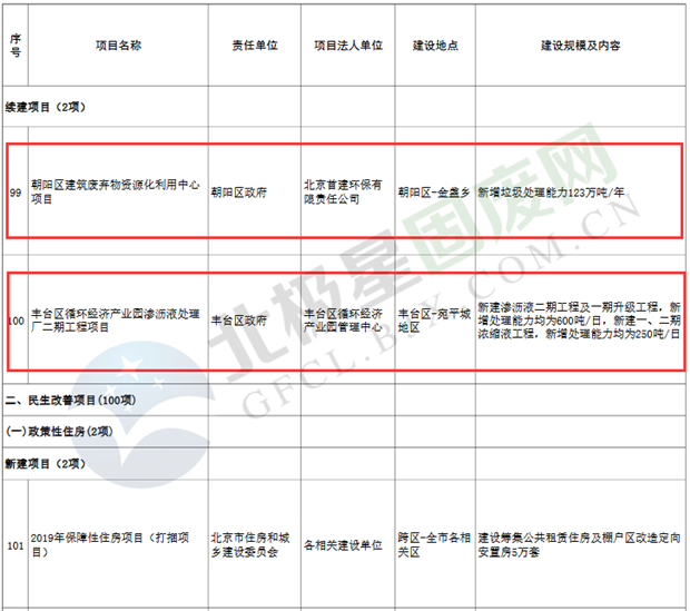 導(dǎo)讀:2019年,北京圍繞首都經(jīng)濟(jì)社會(huì)發(fā)展關(guān)鍵領(lǐng)域和薄弱環(huán)節(jié),謀劃實(shí)施“三個(gè)一百”市政府重點(diǎn)工程,包括100個(gè)基礎(chǔ)設(shè)施、100個(gè)民生改善和100個(gè)高精尖產(chǎn)業(yè)項(xiàng)目。涉及多個(gè)環(huán)保項(xiàng)目,其中垃圾處理設(shè)施項(xiàng)目3個(gè),重點(diǎn)實(shí)施豐臺(tái)區(qū)循環(huán)經(jīng)濟(jì)產(chǎn)業(yè)園滲瀝液處理廠二期工程、朝陽(yáng)區(qū)建筑垃圾資源化處置項(xiàng)目等。