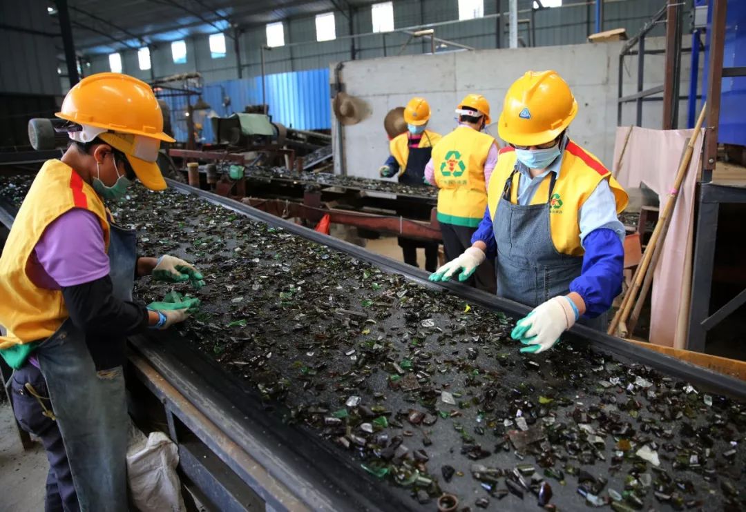 白云區(qū)玻璃回收處理中心:回收的廢棄玻璃制品通過機器進行破碎清洗后,工作人員在進行精細分揀工序,將金屬蓋、塑料蓋徹底分離出來
