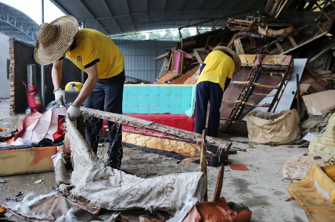 城管委帶隊督查花都區(qū)垃圾分類成效,供銷社垃圾分類點,工作人員在將回收回來的低附加值廢棄家具進行破拆,分類成木材、布料、海綿等經(jīng)行回收。圖為工作人員在破拆一張沙發(fā)