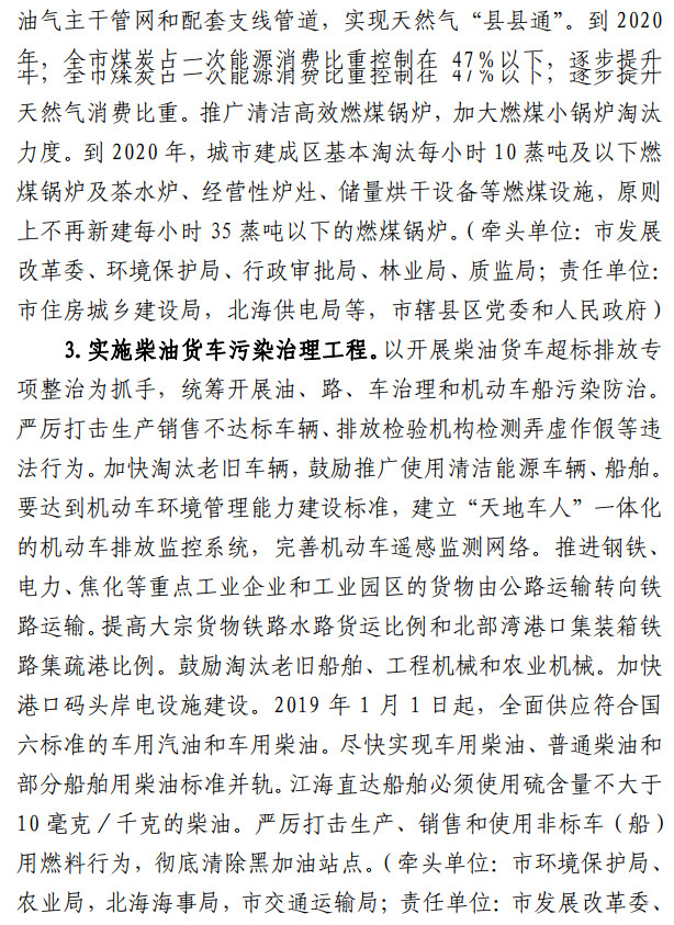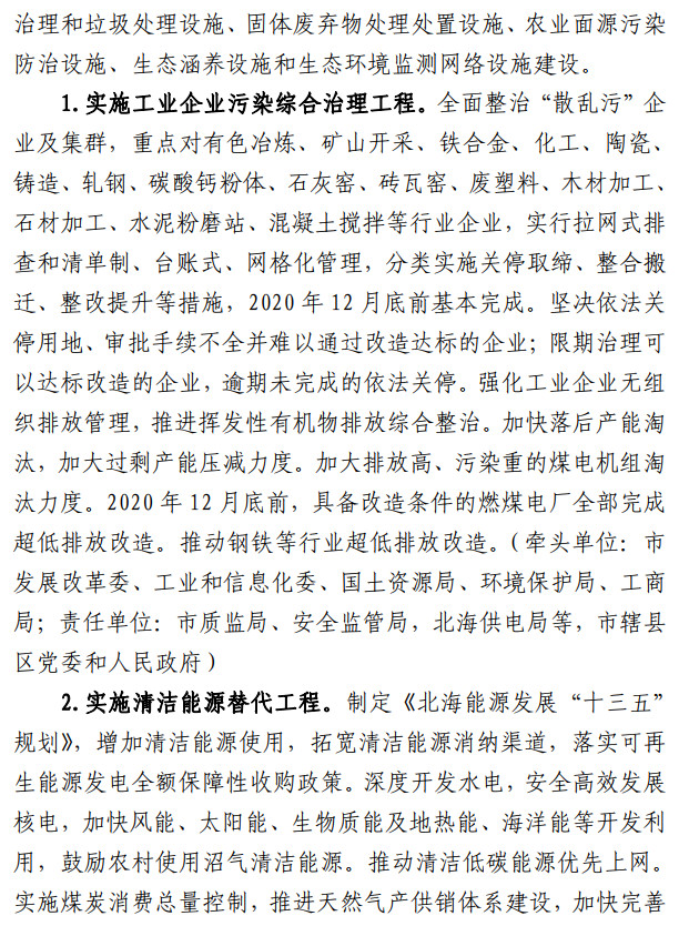 近日,廣西北海市人民政府發(fā)布了全面加強(qiáng)生態(tài)環(huán)境保護(hù)堅(jiān)決打好污染防治攻堅(jiān)戰(zhàn)的意見,本意見規(guī)定堅(jiān)決打贏藍(lán)天保衛(wèi)戰(zhàn)、著力打好碧水保衛(wèi)戰(zhàn)、扎實(shí)推進(jìn)凈土保衛(wèi)戰(zhàn),全面整治“散亂污”企 業(yè)及集群2020 年 12 月底前,具備改造條件的燃煤電廠全部完成 超低排放改造。推動(dòng)鋼鐵等行業(yè)超低排放改造。全文如下: