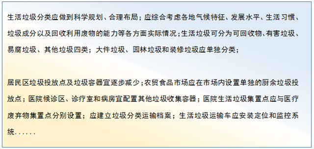 標(biāo)準(zhǔn)分為8章,包括總則、術(shù)語、基本規(guī)定、垃圾類別、分類投放、分類收集、分類運(yùn)輸、分類處理。