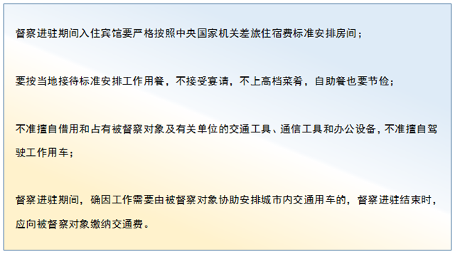 也就是說,環(huán)保督察工作也將參照此標(biāo)準(zhǔn)。而《中央生態(tài)環(huán)境保護(hù)督察紀(jì)律規(guī)定》也從差旅、住宿、接待、交通工具使用等方面提出了具體要求。包括: