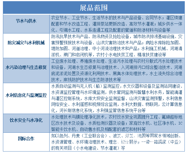 水環(huán)境治理技術(shù)的升級,必然帶來涉水行業(yè)服務(wù)模式的升級,傳統(tǒng)的商業(yè)模式已不能滿足新命題。在此背景下,水博會作為行業(yè)年度盛會,特別將此次輻射網(wǎng)延伸至節(jié)水與供水、防災(zāi)減災(zāi)與水利機(jī)械、水污染治理與生態(tài)修復(fù)、水利信息化與監(jiān)測監(jiān)控、飲水安全與水凈化、國際合作六大領(lǐng)域。具體如下圖所示: