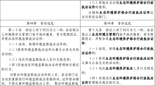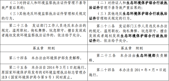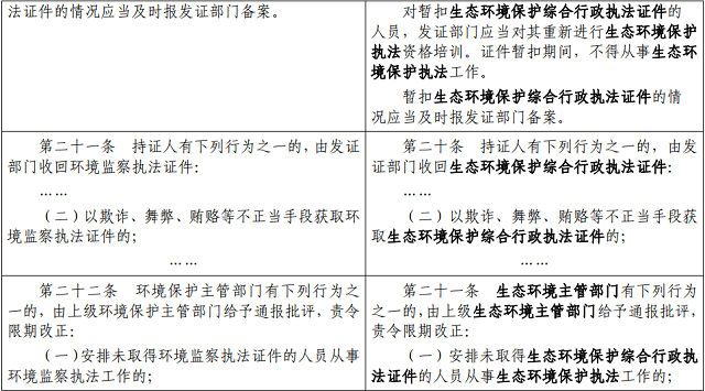 擬將23號(hào)令中“環(huán)境監(jiān)察執(zhí)法證件”修改為“生態(tài)環(huán)境保護(hù)綜合行政執(zhí)法證件”,將條文中“環(huán)境保護(hù)”修改為“生態(tài)環(huán)境”,其他條款同步作相應(yīng)修改。
