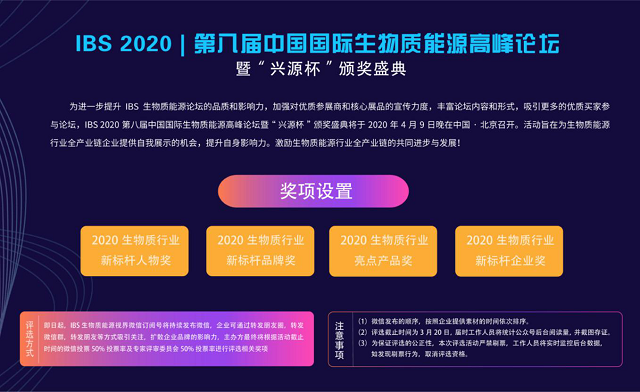 為進一步提升IBS生物質(zhì)能源論壇的品質(zhì)和影響力,加強對優(yōu)質(zhì)參展商和核心展品的宣傳力度,豐富論壇內(nèi)容和形式,吸引更多的優(yōu)質(zhì)買家參與論壇,IBS 2020第八屆中國國際生物質(zhì)能源高峰論壇暨“興源杯”頒獎盛典將于2020年4月9日晚在中國·北京召開。整個會議現(xiàn)場將攜手諸多國內(nèi)外知名媒體進行全程跟蹤報道及宣傳,為生物質(zhì)能源行業(yè)全產(chǎn)業(yè)鏈企業(yè)提供自我展示的機會,更好的樹立公信力和品牌影響力塑造。