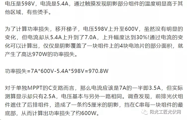 經(jīng)過勘探與計算得出該電站的功率因為兩處陰影導(dǎo)致?lián)p失高達1570W。除了功率損失之外,光伏系統(tǒng)中的陰影造成熱斑,長期如此,會加速組件老化,嚴重影響組件壽命。