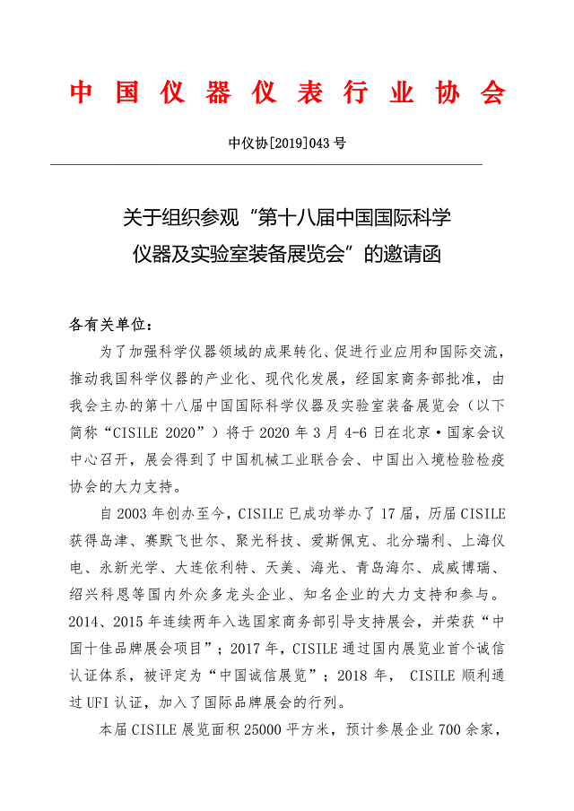 中國儀器儀表行業(yè)協(xié)會正式發(fā)文邀請單位組織人員參觀本次展會,詳情文件如下: