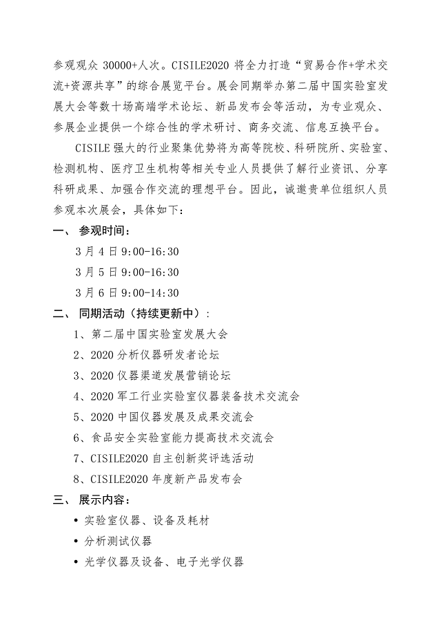 第十八屆中國國際科學(xué)儀器及實驗室裝備展覽會(CISILE2020)將于2020年3月4-6日在北京·國家會議中心召開,預(yù)計展示面積25000平方米,參展企業(yè)700余家,參觀人次30000人次,同期將舉辦多元化的論壇及互動活動,為廣大科研人員及行業(yè)人士便捷地獲取行業(yè)新資訊、分享前沿技術(shù)和研究成果、交流研討產(chǎn)業(yè)政策搭建交流的平臺。